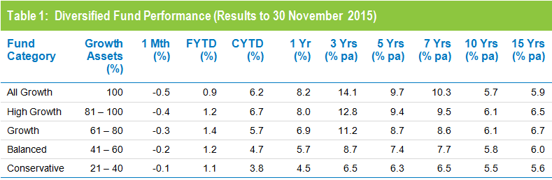 Listed share markets, which are the main drivers of growth fund performance, were mixed in November. Australian shares were down 0.7%, and while hedged international shares were up slightly at 0.7%, the appreciation of the Australian dollar (up 1¢ to US$0.72 over the month) meant that the return in unhedged terms was actually down 2.1%. Listed property also had a negative month, with Australian and global REITs down 2.8% and 1.2%, respectively.