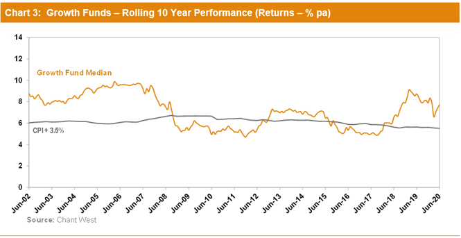Chart 3 shows that, for the majority of the compulsory super era, the median growth fund has exceeded its return objective. The exceptions are two periods between mid-2008 and mid-2017, when it fell behind. This is because of the devastating impact of the 16-month GFC period (end-October 2007 to end-February 2009) during which growth funds lost about 26% on average. That impact persists far longer in a rolling 10-year chart than it does in our previous rolling five-year chart.