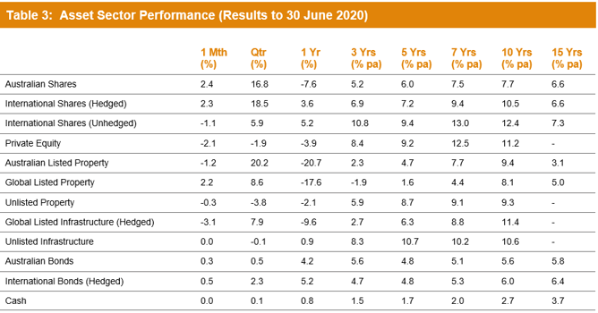 Table 3 shows the performance of all the main asset sectors over different time periods to the end of June 2020. We have used market indices for all sectors other than private equity. For this sector, we have used the returns of a major fund in our survey that are representative of those markets.