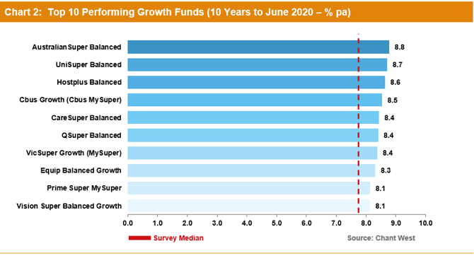 Chart 2 shows the top 10 performing growth options over 10 years, together with the survey median.