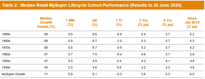 Despite a strong June 2020 quarter, the major setback in February and March has resulted in those options that have higher allocations to growth assets generally faring slightly worse over the financial year. Over longer periods those higher-risk options, which cover the younger cohorts born in the 1960s or later, have generally performed better, although not as well as the median MySuper Growth option.