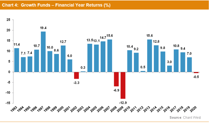 Chant West senior investment manager Mano Mohankumar says: “It was a topsy turvy year that can be split into three parts. Over the first seven months to January, growth funds gained an impressive 6.4%. Then over February and March, the seriousness of the COVID-19 pandemic and its likely impact on the global economy saw share markets take a severe beating, and funds gave up a staggering 12% in just a few weeks. However, a surprisingly sharp share market rally over the June quarter saw them bounce back 6.5% to finish the year virtually flat.