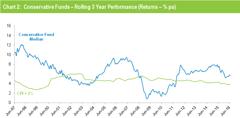 Chart 2 compares the performance of the lower risk Conservative category (21 to 40% growth assets) median with its typical objective of CPI plus 2% per annum over rolling three year periods. It shows that Conservative funds have also exceeded their objective in recent years.