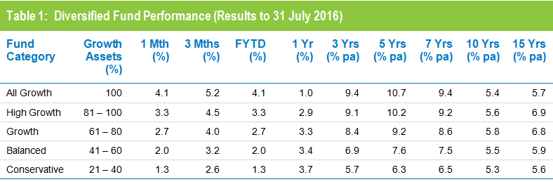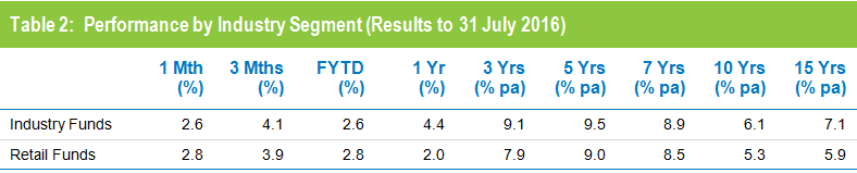 Retail funds slightly outperformed industry funds in July, returning 2.8% versus 2.6%. However, industry funds continue to hold the advantage over the longer term, having returned 7.1% per annum against 5.9% for retail funds over the 15 years to July 2016, as shown in Table 2.