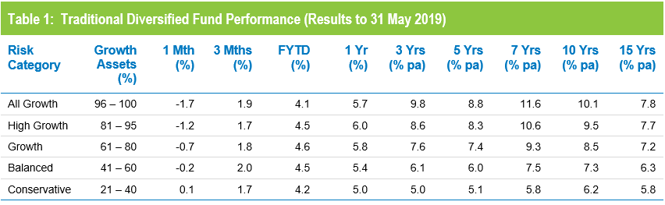 Share markets, which are the main drivers of growth fund performance, were mixed in May. Australian shares gained 1.7% while hedged international shares fell 5.9%. The depreciation of the Australian dollar over the month (down from US$0.70 to US$0.69) trimmed the loss to 4.4% in unhedged terms. Listed property was similarly mixed, with Australian REITs up 2.3% but international REITs down 0.3%.