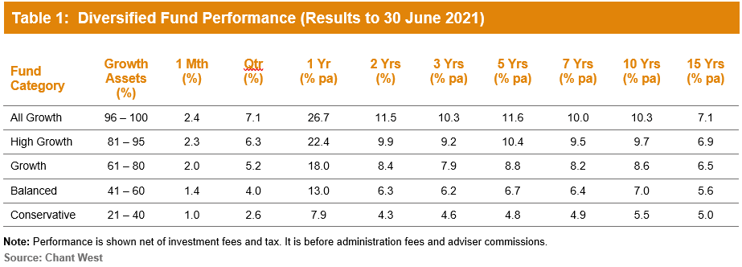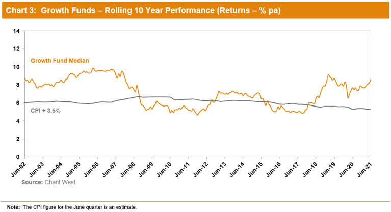 Table 1 compares the median performance for each of the traditional diversified risk categories in Chant West's Multi-Manager Survey, ranging from All Growth to Conservative. Over all periods shown, all risk categories have met their typical long-term return objectives, which range from CPI + 2% for Conservative funds to CPI + 4.25% for All Growth.