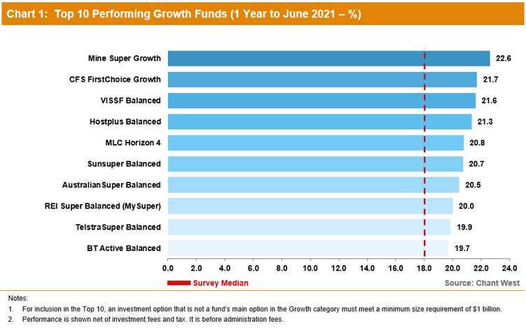 Chart 1 shows the top 10 performing growth options over the 2020/21 financial year, together with the survey median.