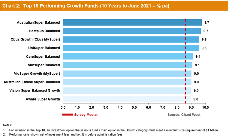 Chart 2 shows the top 10 performing growth options over 10 years, together with the survey median.