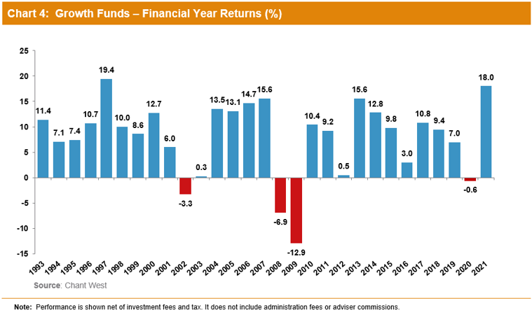 "Returns are important but so is risk, and most funds also set themselves a risk objective. Risk is normally expressed as the likelihood of a negative annual return, and typically a growth fund would aim to post no more than one negative return in five years on average. Chart 4 plots the year-by-year performance of the median growth fund over the 29 financial years since the introduction of compulsory super. The objective would be no more than five negative years in that time. As it turns out there have only been four, so the risk objective has been met as well as the performance objective." Mohankumar said.