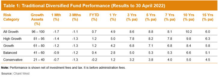 Super funds took a step backwards in April, with the median growth fund (61 to 80% in growth assets) down 1.2% for the month. That reversed a similar gain in March and pulled the median return over first ten months of the 2021/22 financial year back to 1.2%. With share markets down so far in May we estimate that, with only about six weeks remaining, the financial year return is near break-even, at -0.5%.