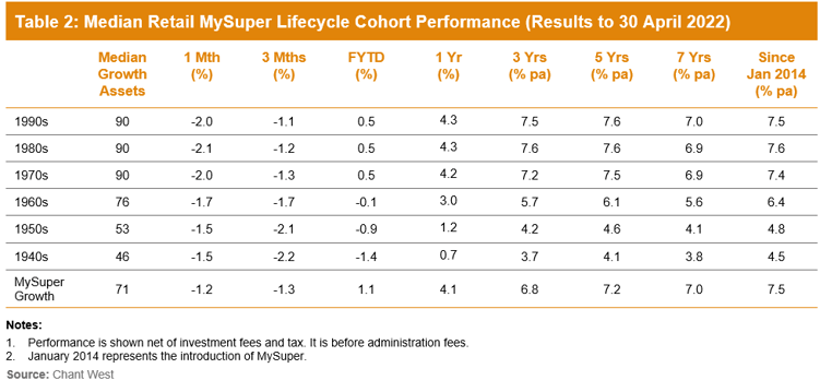 “It’s difficult to make direct comparisons of the performance of these age-based options with the traditional options that are based on a single risk category, and for that reason we report them separately. Table 2 shows the median performance for each of the retail age cohorts, together with their current median allocation to growth assets. For comparison purposes it also includes a row for traditional MySuper Growth options – nearly all of which are not-for-profit funds. Care should be taken when comparing the performance of the retail lifecycle cohorts with the median MySuper Growth option, however, as they’re managed differently so their level of risk varies over time.”