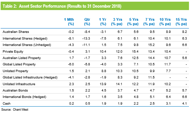 “The better performing funds in 2018 were those that had relatively higher allocations to unlisted assets – infrastructure, property and private equity – and to bonds at the expense of shares. Having a higher proportion of your international shares unhedged would have also helped, because the depreciation of the Australian dollar turned the unhedged loss of 7.5% for that sector into a 1.5% gain in unhedged terms.”