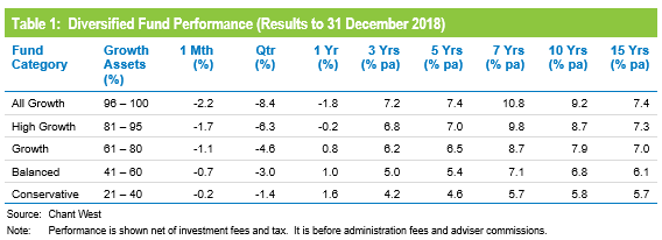 “The power of diversification was clearly evident in 2018. When you consider that the Australian share market fell 3.1% and international shares 7.5%, the median growth fund was still able to eke out a positive return. That’s because, while these funds do invest substantially in shares they also invest in a wide range of other asset sectors including unlisted assets and traditional defensive assets such as bonds and cash, all of which produced positive returns for the year.