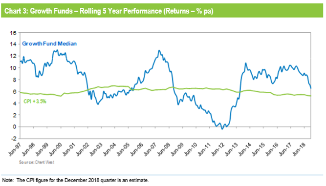 “That’s borne out visually in Chart 3, which compares the growth category median with the average return objective of CPI plus 3.5% per annum over rolling five year periods – that’s after investment fees and tax. Until 2009, the median fund outperformed the target most of the time. The GFC brought that to an abrupt halt, and the median dipped below the target line for several years. Now, with the GFC period out of the calculation, the five year return has been tracking well above the target line for the past five years.”