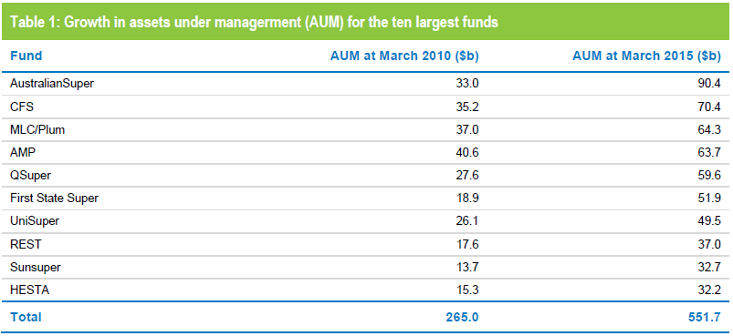 Contribution flows, fund consolidation and rising investment markets have resulted in massive growth in some of our major funds. Table 1, for example, shows the increase in assets under management for the ten largest funds over the 5 years to 31 March 2015.