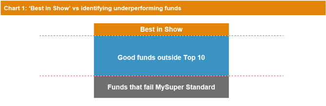 The second problem of defaulting members into underperforming funds is more complex and any solution is likely to be more contentious. The Productivity Commission’s favoured solution was to limit the funds to which members could be defaulted to the Top 10 so-called ‘Best in Show’. This approach, while superficially appealing, has many shortcomings.