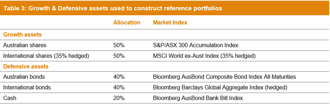 For each MySuper product we have constructed a reference portfolio by combining the growth and defensive assets shown in Table 3 in proportions that match our normalised growth/defensive assessment for that product each year. This includes lifecycle products where the reference portfolios used for each year reflects the average level of growth assets over the year, which for certain lifestages changes quite significantly over a 5-10 year period.