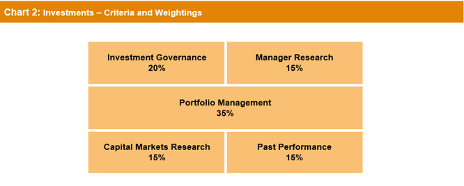 Chart 2 shows the high level criteria we consider and their weightings. Each of these criteria has a number of sub-criteria that we score.