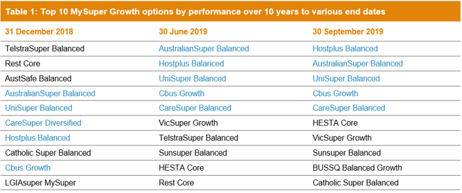 Perhaps the biggest shortcoming of the Top 10 approach, assuming it would have a high weighting to investment performance, is that it would be inherently unstable. The performance differential between the 20 top-performing funds is quite small, so any list of the ten top-performing funds will be constantly changing. Table 1 shows the 10 top-performing Growth options (61 to 80% growth assets) for 10 years to 31 December 2018, 30 June 2019 and 30 September 2019. The highlighted funds are the only ones that appear in the top 10 over each period – there are only five!