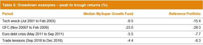 A more meaningful and obvious measure of risk is drawdown (peak to trough loss). Table 5 compares the drawdown for our median MySuper Growth fund with the drawdown of our 70/30 reference portfolio comprising only listed shares, bonds and cash. We have looked at two extended periods of sharemarket weakness, the tech wreck and the GFC, and two much shorter periods, the European debt crisis in mid-2011 and the heightened trade tensions in the December 2018 quarter. It can clearly be seen that the median MySuper Growth fund has provided a greater cushion than the reference portfolio during each of those four periods.