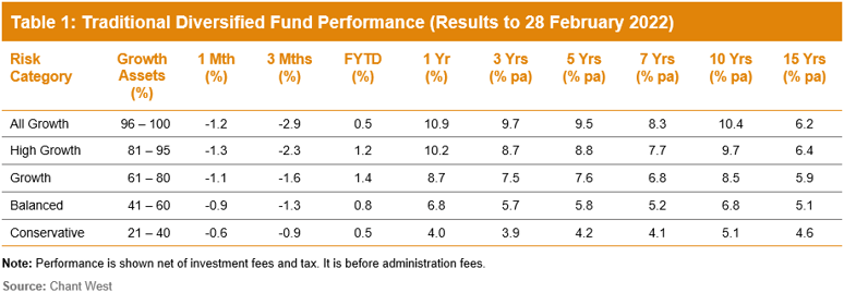 Chant West Senior Investment Research Manager, Mano Mohankumar, says that concerns around Russia’s invasion of Ukraine dominated market sentiment in February. “Markets reacted nervously but once again, however, we saw the benefits of diversification at play. With the average growth fund having about 55% allocated to listed share markets, they remain the main drivers of performance. The conflict in Ukraine resulted in international shares falling 2.8% in hedged terms in February, and the appreciation of the Australian dollar over the month increased the loss to -5.5% in unhedged terms. However, Australian shares were actually up 2.1% for the month. That, along with the fact that growth funds have about 45% allocated to a wide range of assets other than listed shares, helped limit the overall loss to 1.1% for the month.
