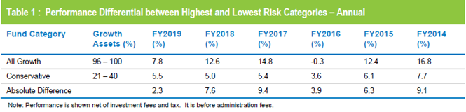 The compression of returns in the 2019 financial year also meant that the median returns of the not-for-profit and retail sectors were closer than normal. Looking at traditional growth options, the not-for-profit median was 7% while the retail median was 6.9%.