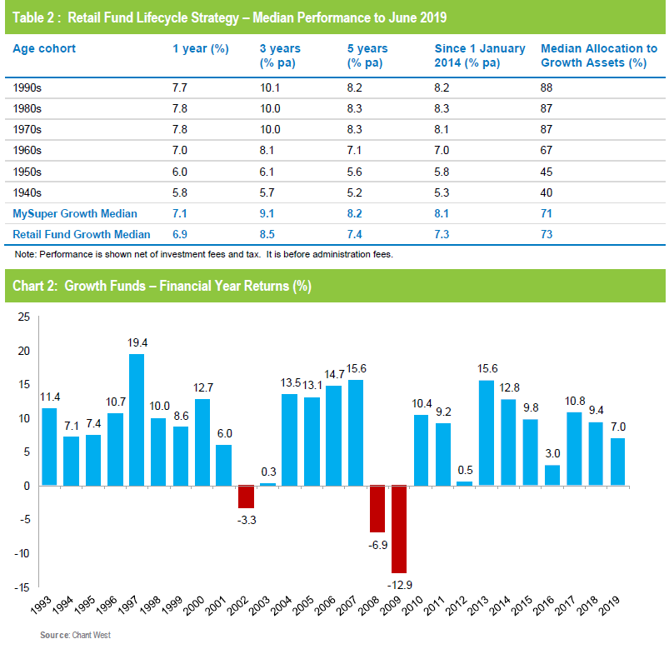 In Table 2 we compare the median performance of each of the retail age cohorts over one, three and five years to June 2019 and over the entire MySuper era that began on 1 January 2014. We also show the median performance of the overall MySuper growth universe and of the retail funds’ traditional growth options. In each case we show the current median allocation to growth assets, so as to illustrate the relative risk characteristics of the different options.