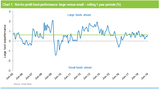 The chart shows that large funds have been ahead more often than not. In fact they outperformed in 85% of all those one year periods while small funds led just 15% of the time. Over the 15 years to June 2019, the median return for large funds is about 0.6% per annum ahead of the small fund median return (represented by the green line in the chart). Scale – and the opportunities and economies that flow from it – certainly appears to be a contributing factor to performance.